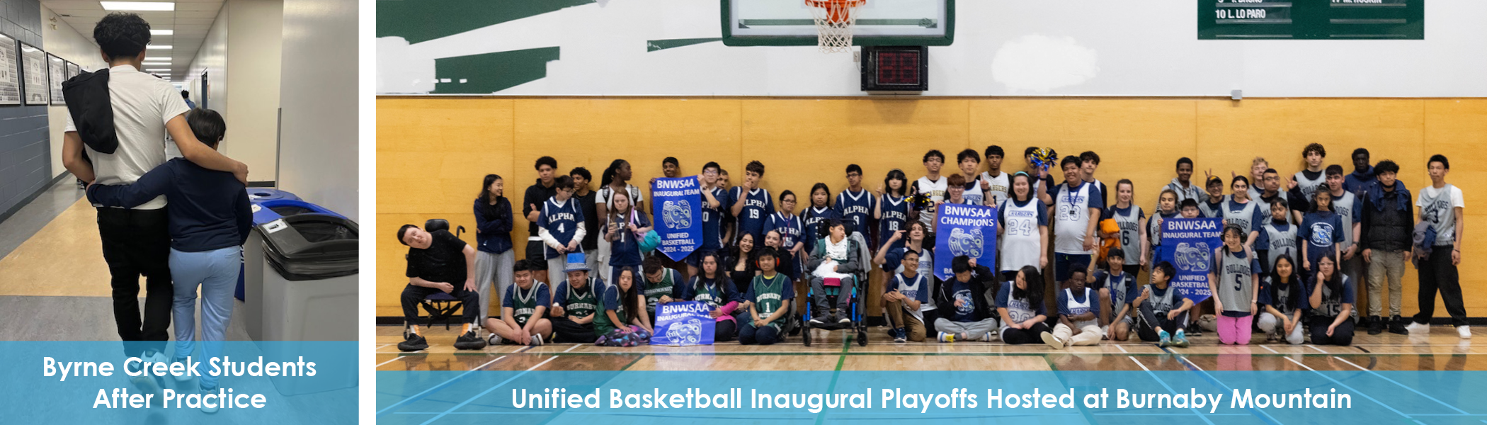 The first-ever Unified Basketball playoffs in the District were hosted by Burnaby Mountain Secondary at the end of May. Teams from Alpha, Byrne Creek, Burnaby Mountain, and Cariboo Hill Secondary schools joined in on the fun and action. In the 2023-24 school year, youth at Burnaby Mountain became the first to have a Unified Basketball team in the District. Teams are made up of students with disabilities or diverse abilities, alongside neurotypical youth and athletes. The hallmarks of Unified Sports include building inclusion, friendship, and understanding through sport. Watch a student-created video capturing some of the magical highlights from the playoffs here.