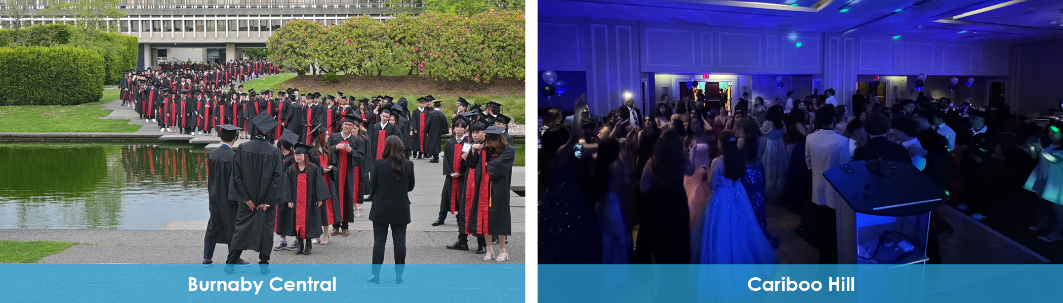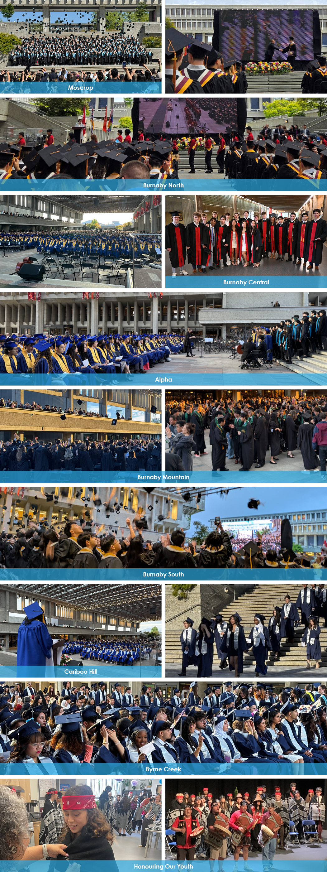 Each high school held ceremonies for all graduates on top of Burnaby Mountain at Simon Fraser University. Grade 12 students walked through the picturesque setting to meet with the awaiting crowd. School staff joined families in sharing pride in the students’ accomplishments.