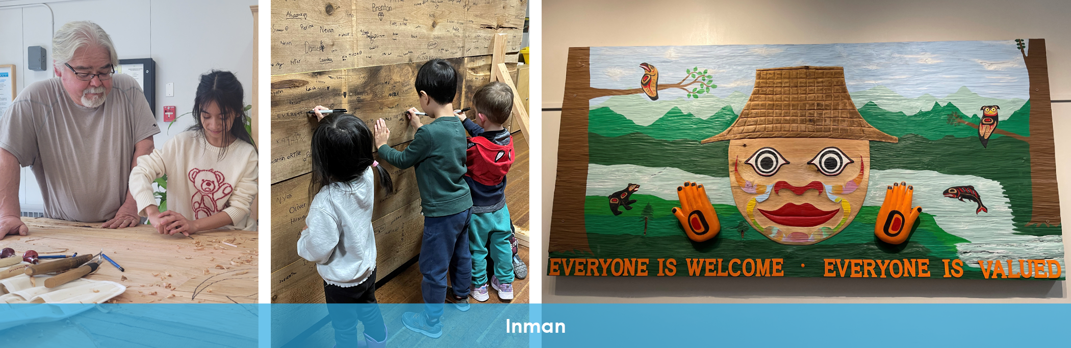 Under the guidance of Indigenous artist Simon James from the Kwakwaka’wakw Nation, the entire school at Inman Elementary took part in a carving project entitled Everyone is Welcome – Everyone is Valued. The school collaborated with the District’s Indigenous Education team to ensure local teachings and protocol were honoured. The final carving incorporates Coast Salish stories and symbols – including hands raised in a traditional welcome. Students signed the back before the carving was installed near the school entrance, where it is placed as a symbol of respect, inclusion, and Reconciliation.