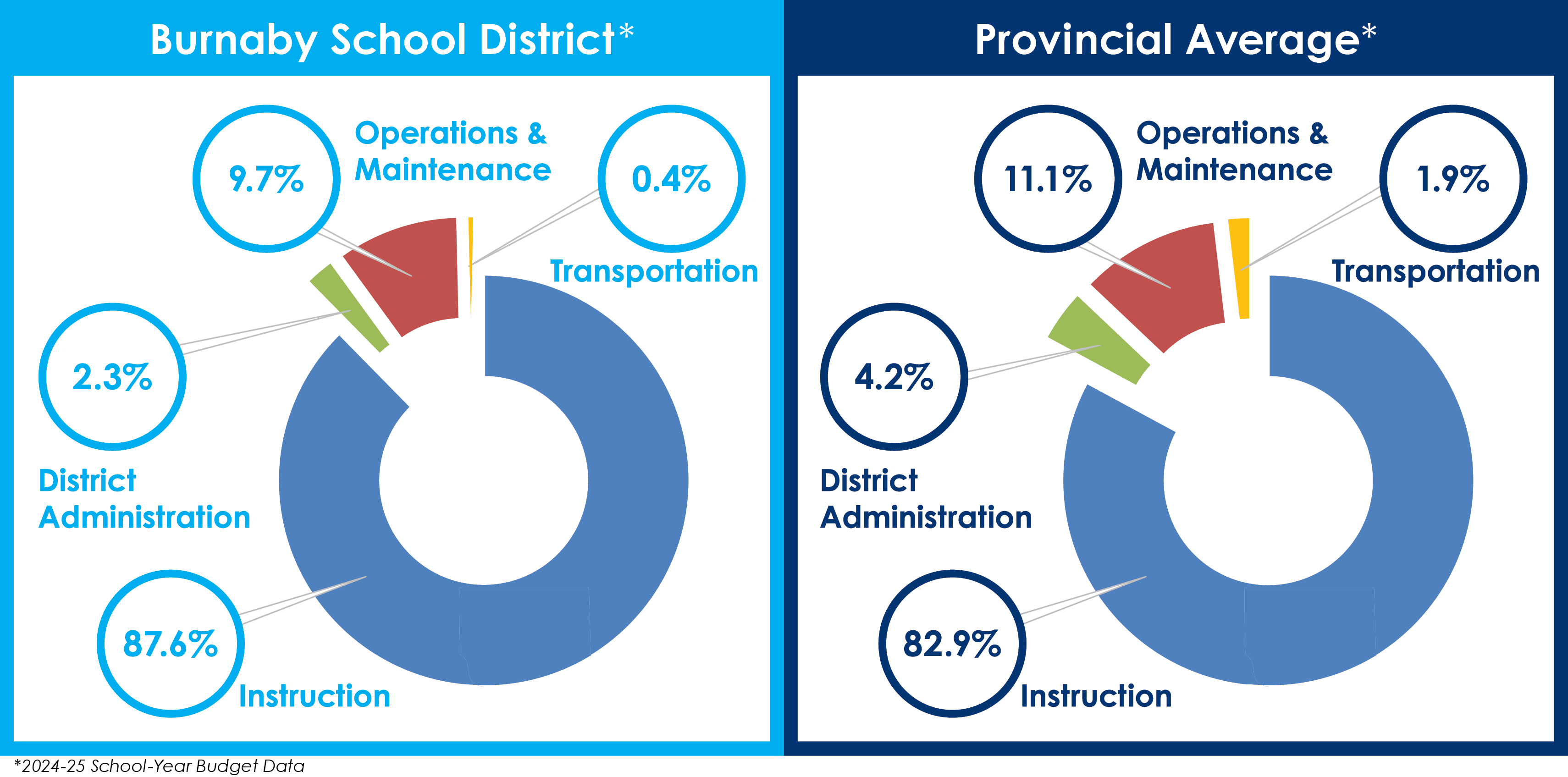 Most of the overall budget is allocated to specific needs, with the vast majority going toward instruction. The District is consistently below the provincial average on other expenditures.