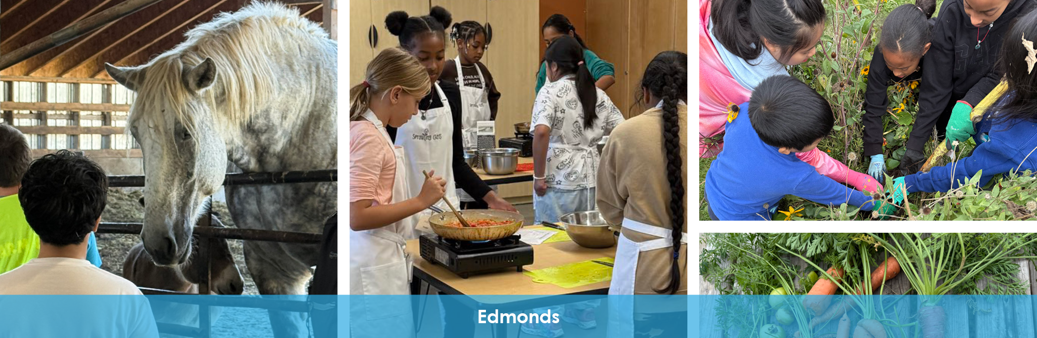Children at Edmonds Community School connected with nature during a visit to see the animals at Aldor Acres Family Farm. Through a partnership with Sprouting Chefs, students at Edmonds did cooking classes after school, including with food grown in the school garden. The after-school Garden Club at Edmonds has been harvesting carrots and more.