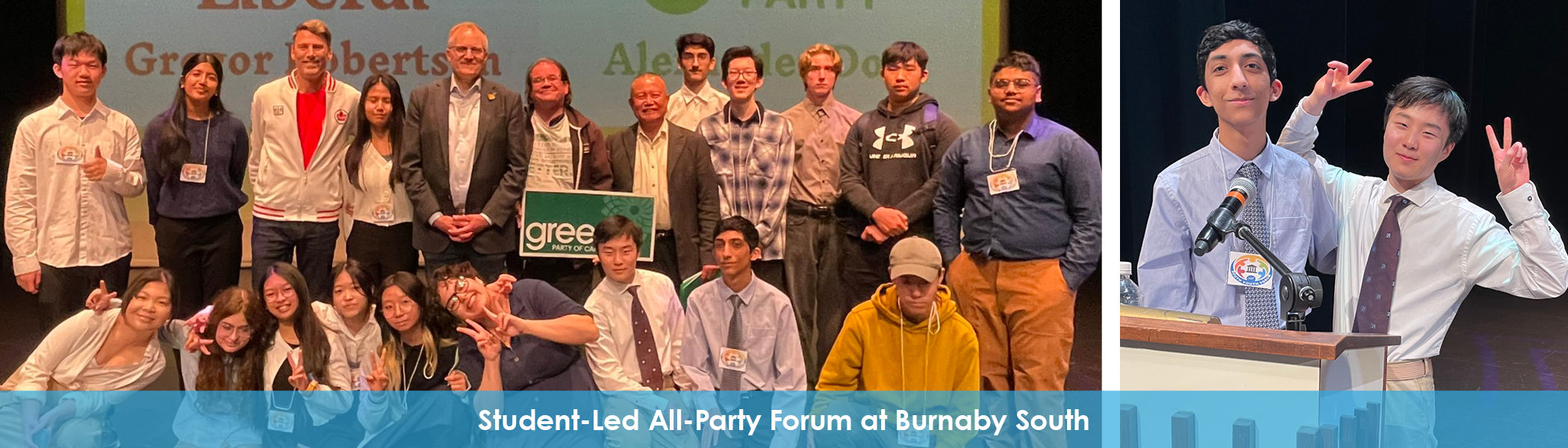 Burnaby South Secondary students invited all candidates in the local riding to a forum attended by Grade 8 to 12 Social Studies classes. In addition to organizing the event, student-leaders in the South Youth Forum Club also moderated the question-and-answer session at the All-Party Forum. Nearly 600 students had the chance to learn about the democratic process and hear firsthand from potential political leaders about issues that matter most to students.